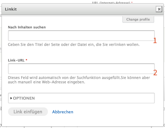 Im Text-Editor können Sie Textstellen mit anderen Seiten verlinken, in dem Sie den betreffenden Text auswählen und dann das Link-Symbol in der Symbolleiste klicken. Es öffnet sich ein Fenster, in dem Sie entweder nach Inhalten auf der Website suchen können (1) oder direkt die Adresse einer externen Website eingeben (2).
